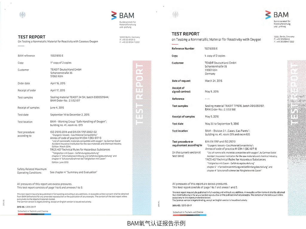 SealTex索拓合作品牌TEADIT泰迪如下型號具有BAM氧氣認證測試報告: